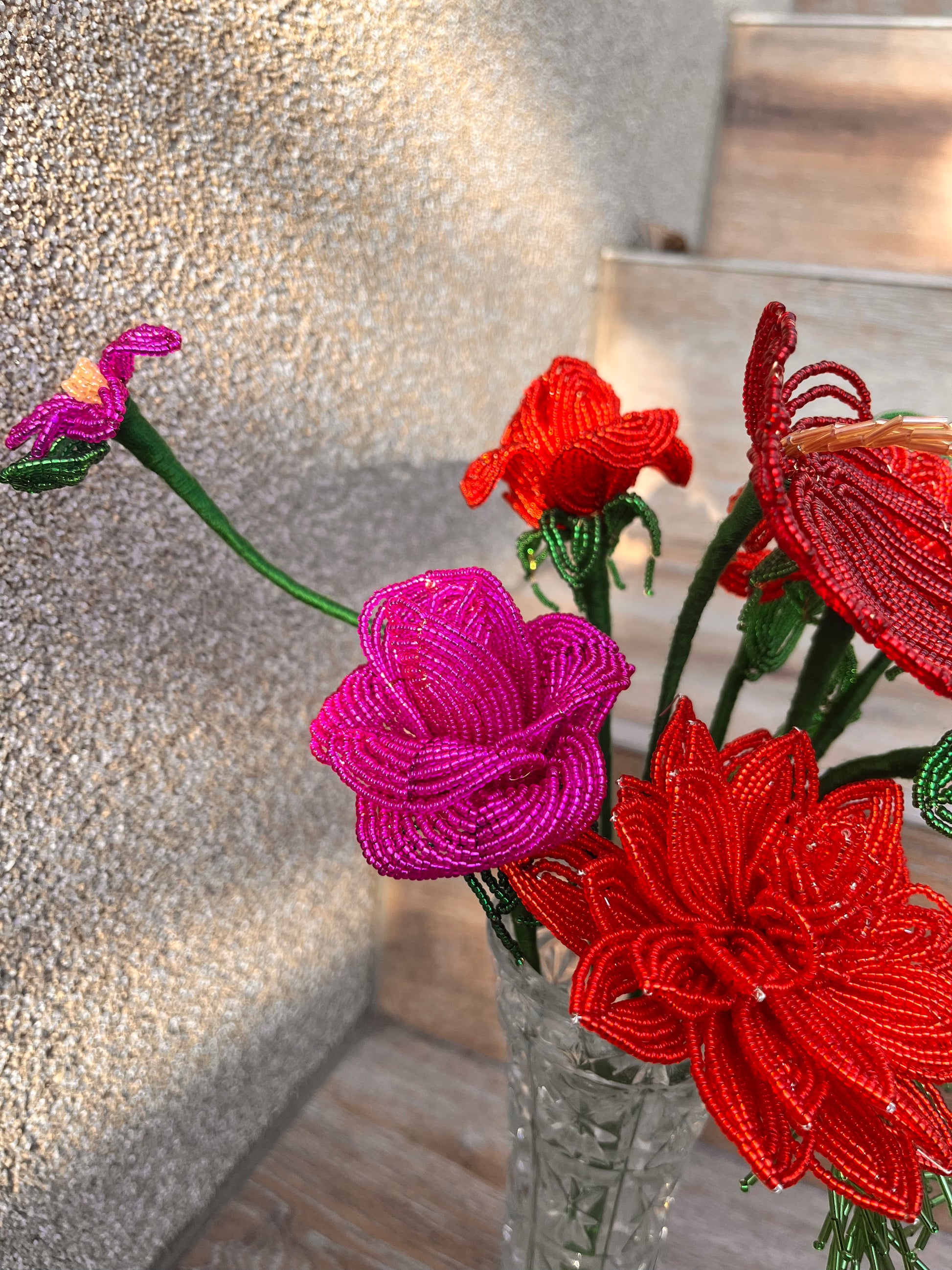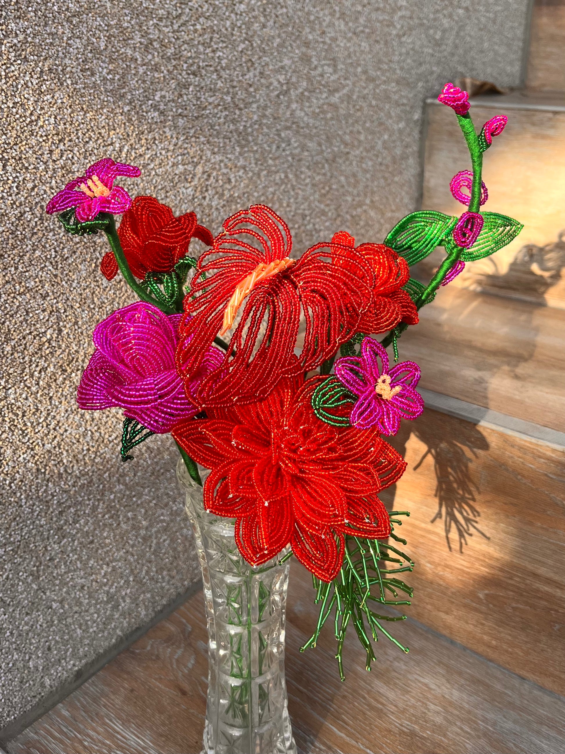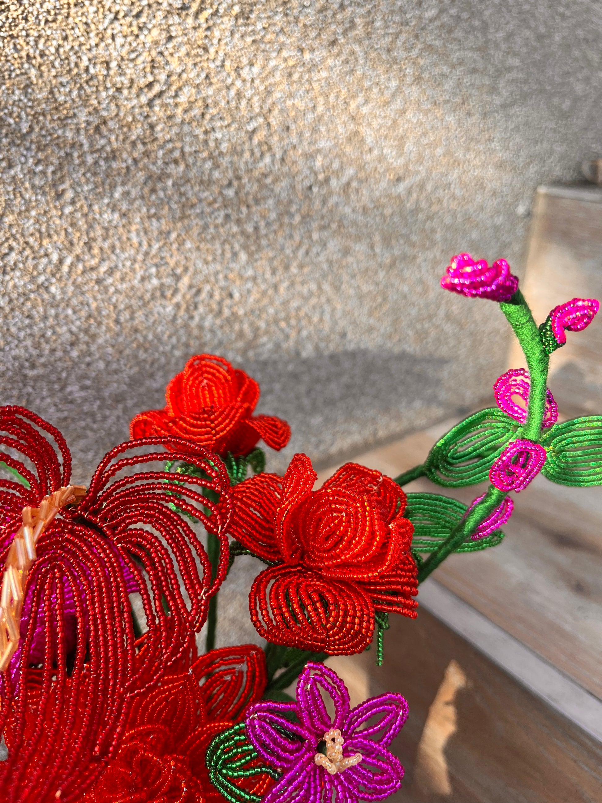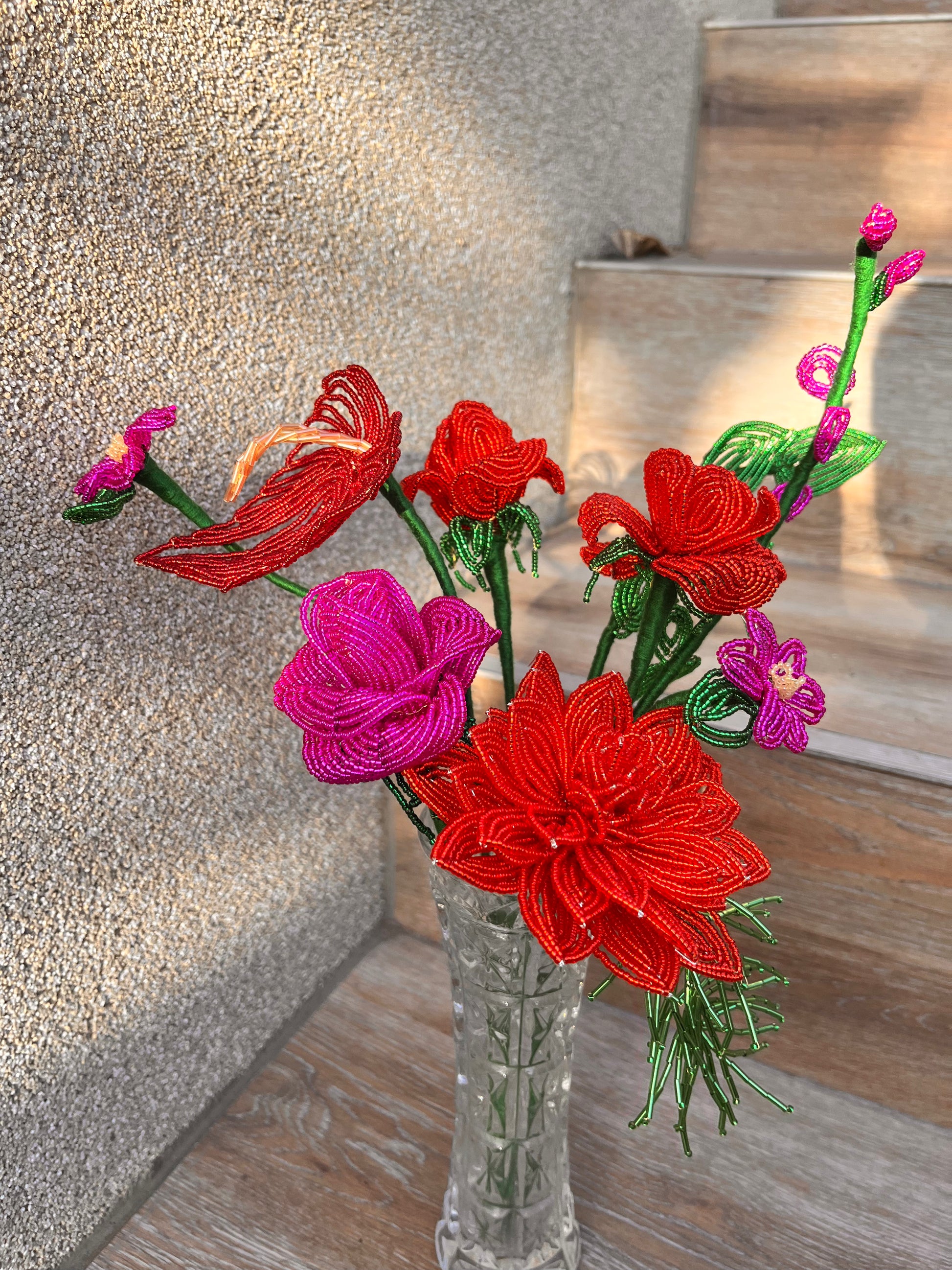 Minden darab kézzel készül, francia gyöngyfűzési technikával. Miyuki gyöngyökből és finom drótból formálva, aprólékos munkával. Egy-egy virág több órás, gondos kézimunka eredménye.