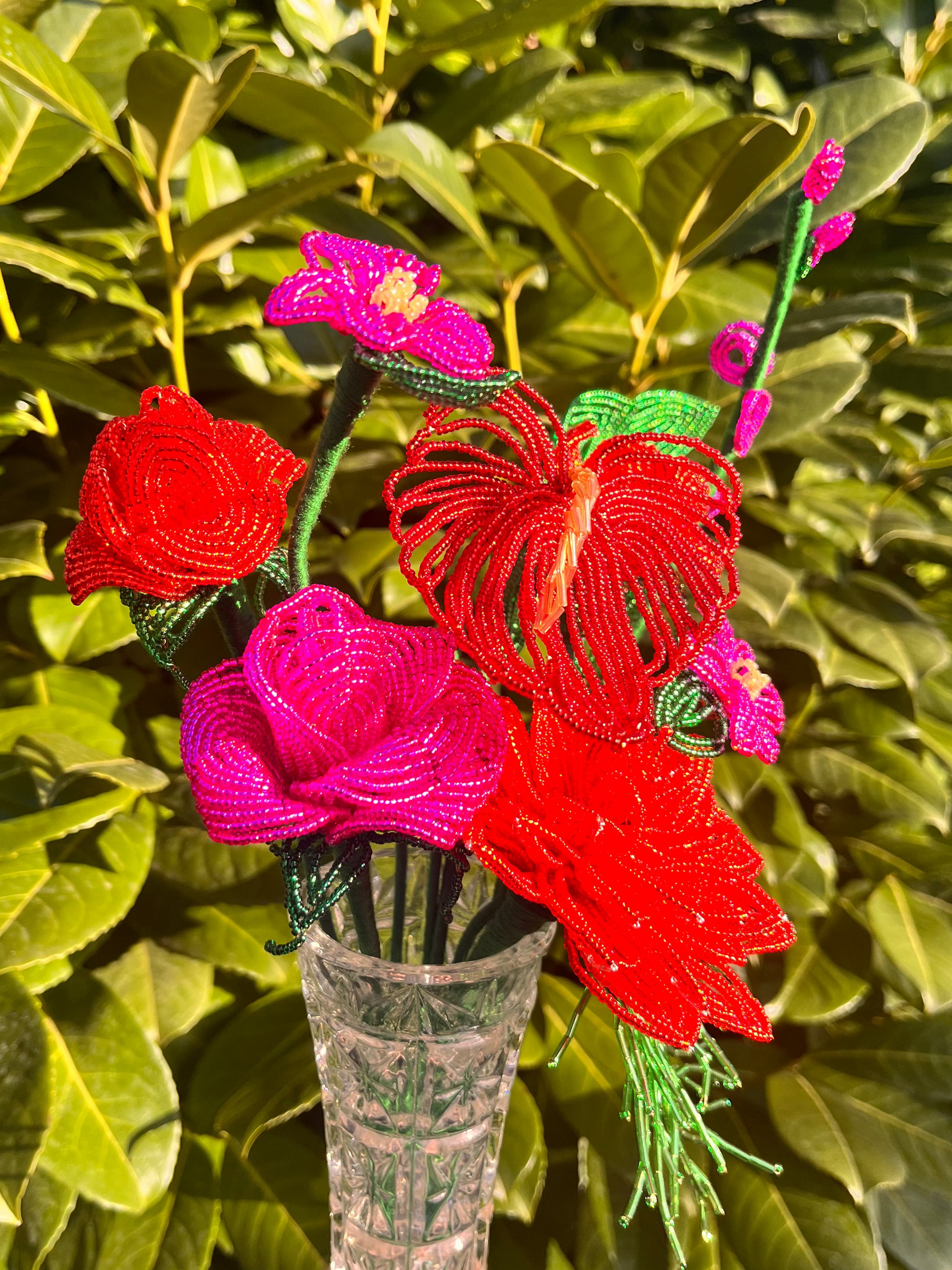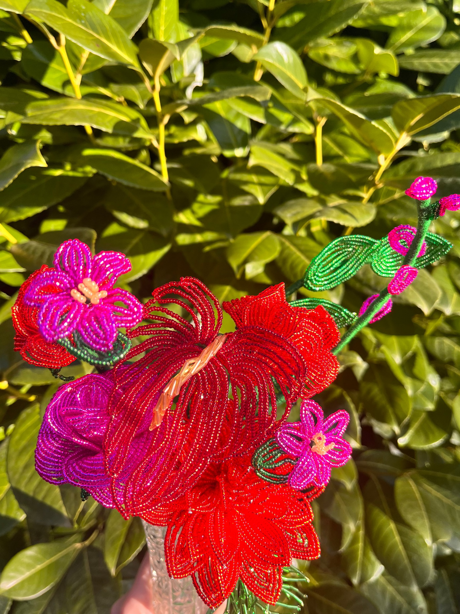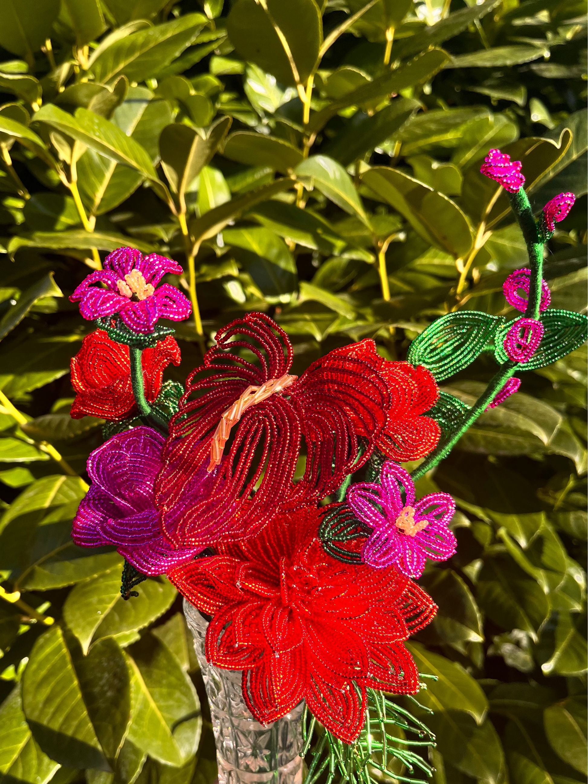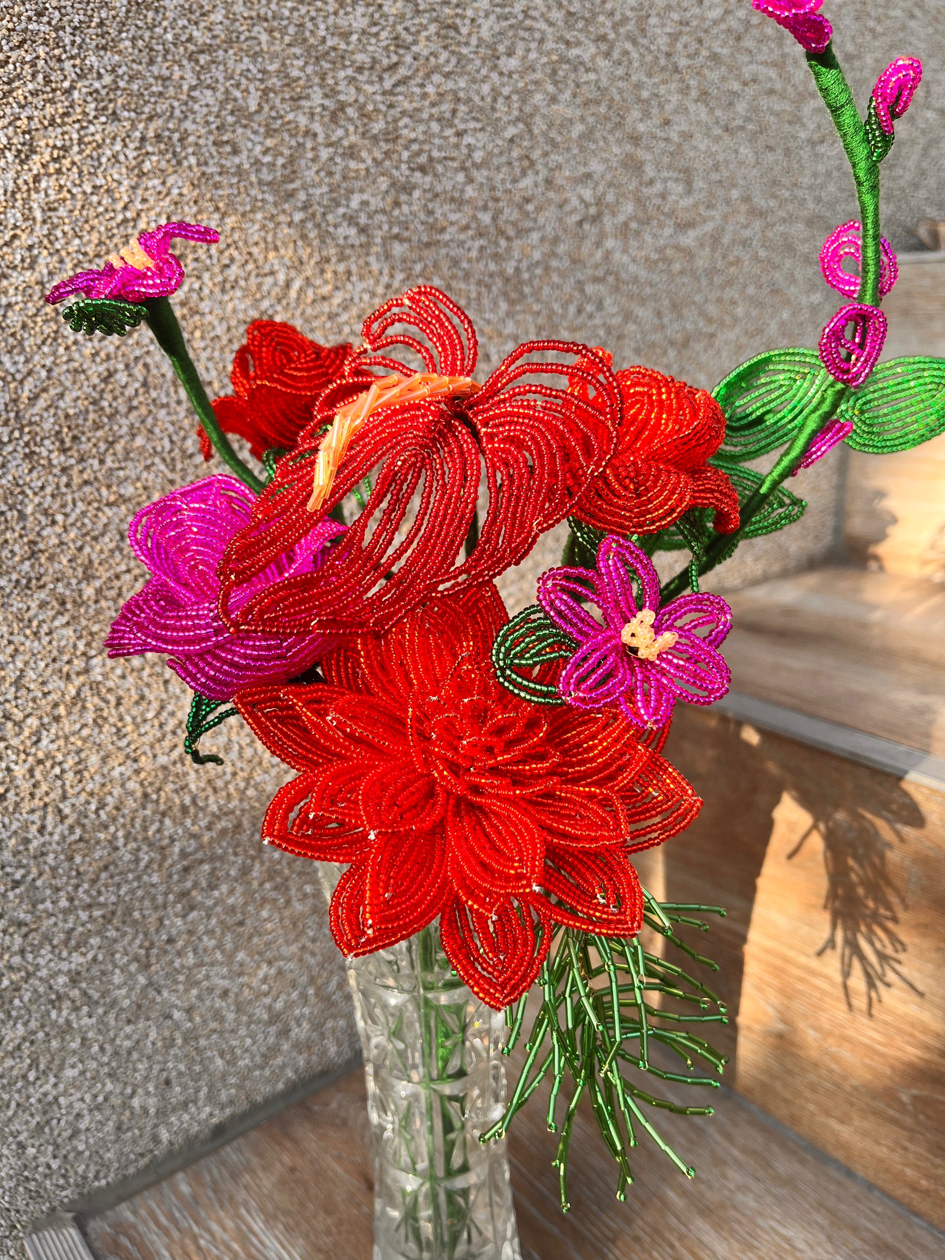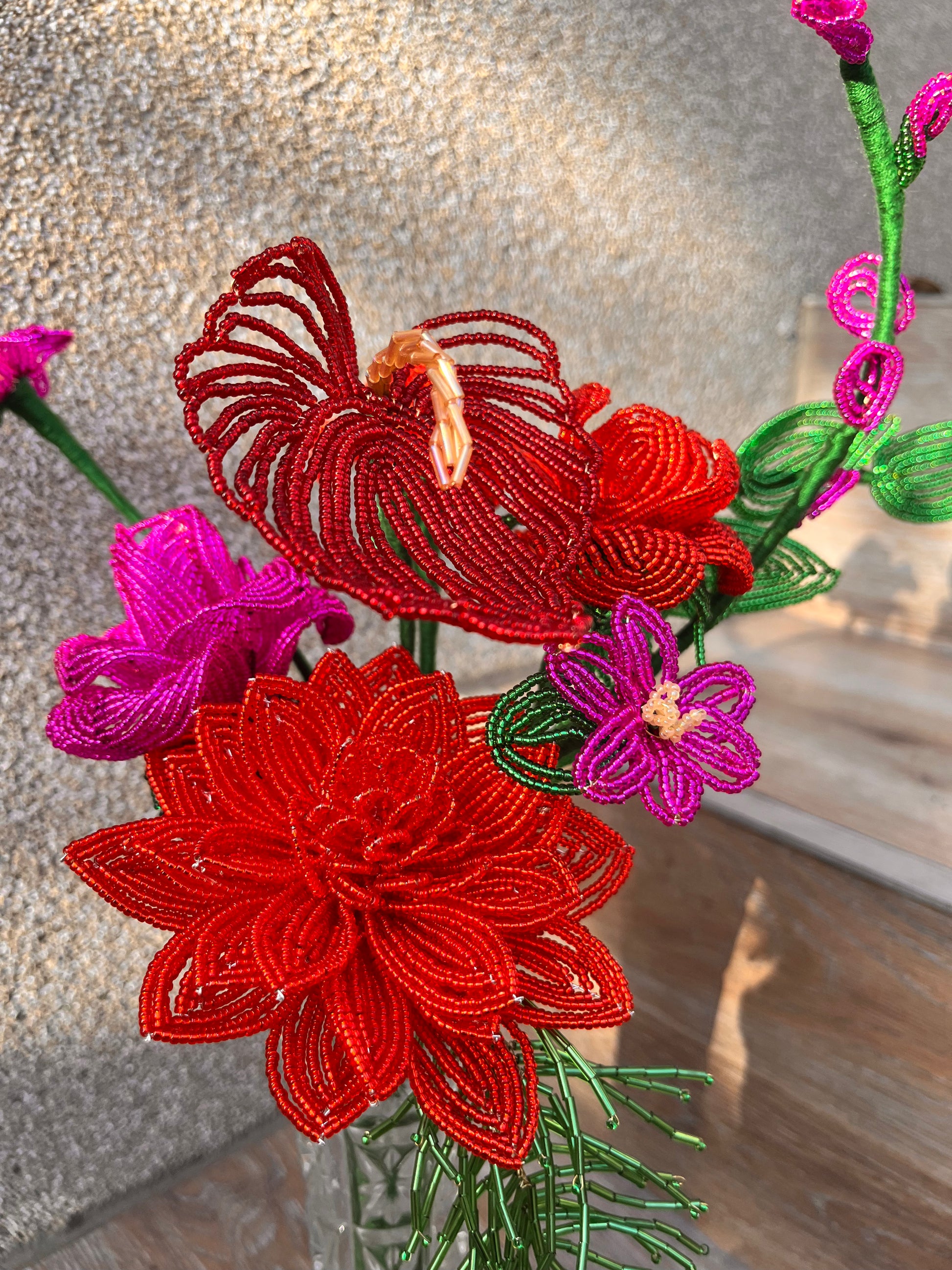 Minden darab kézzel készül, francia gyöngyfűzési technikával. Miyuki gyöngyökből és finom drótból formálva, aprólékos munkával. Egy-egy virág több órás, gondos kézimunka eredménye.
