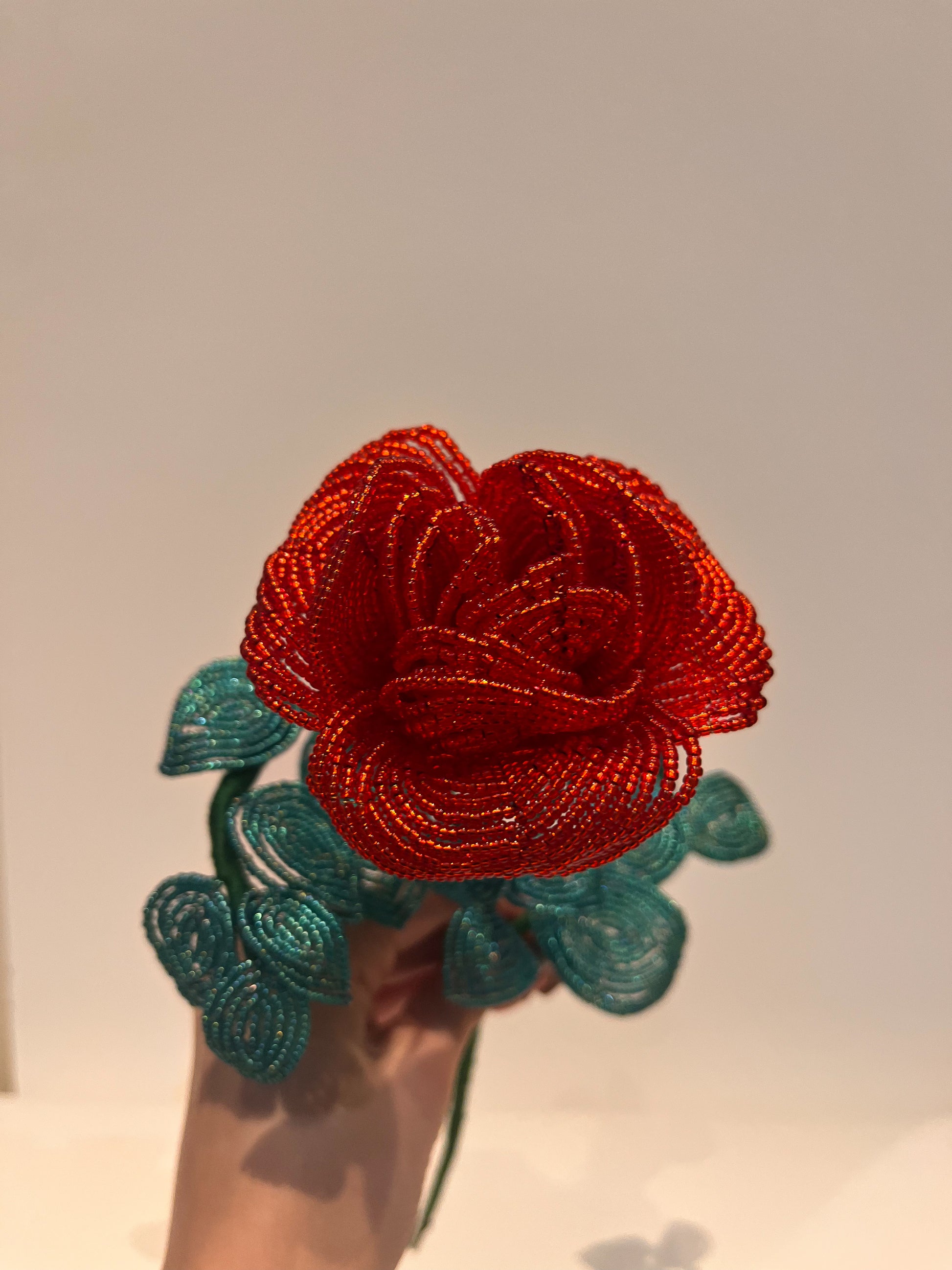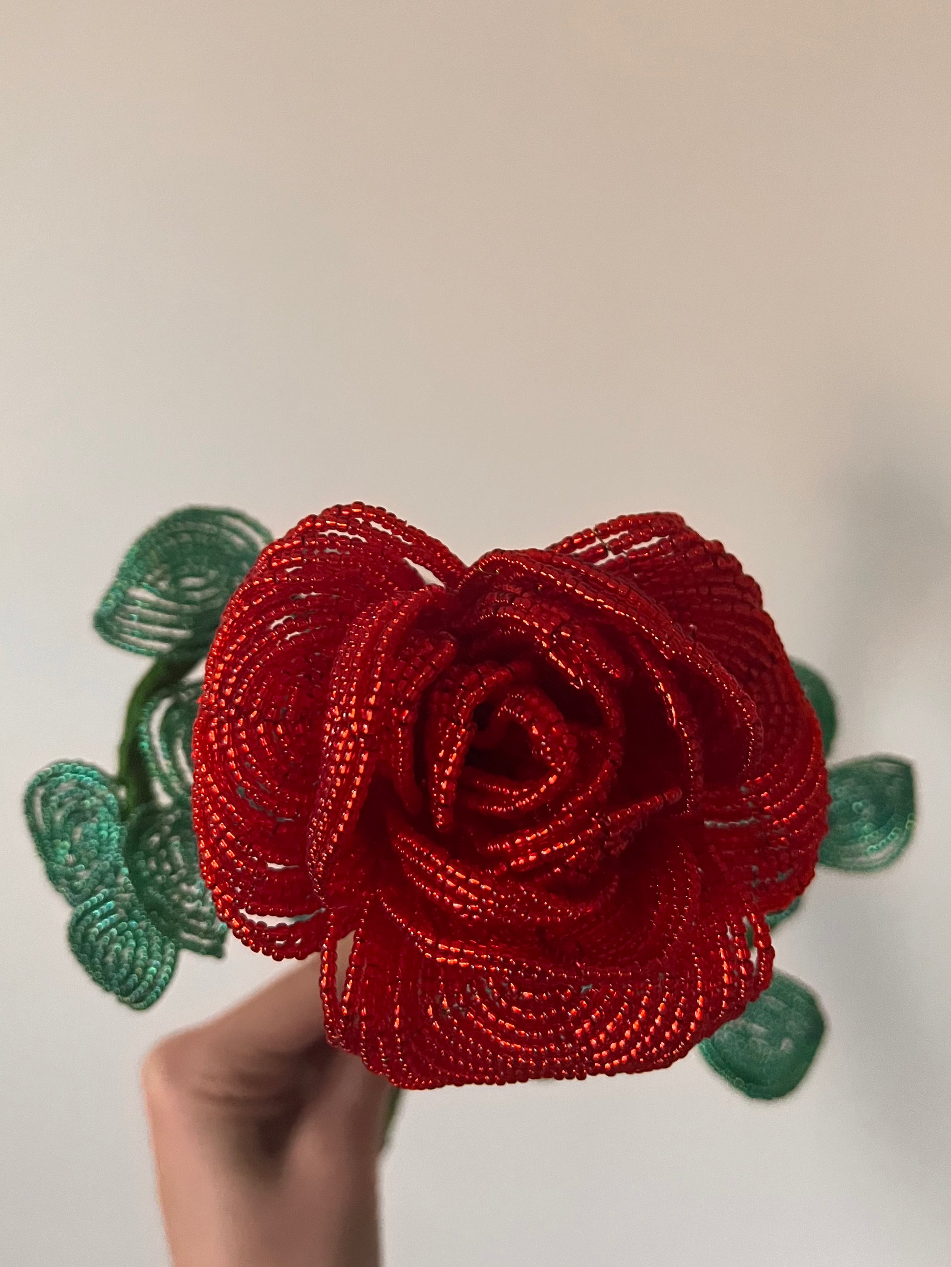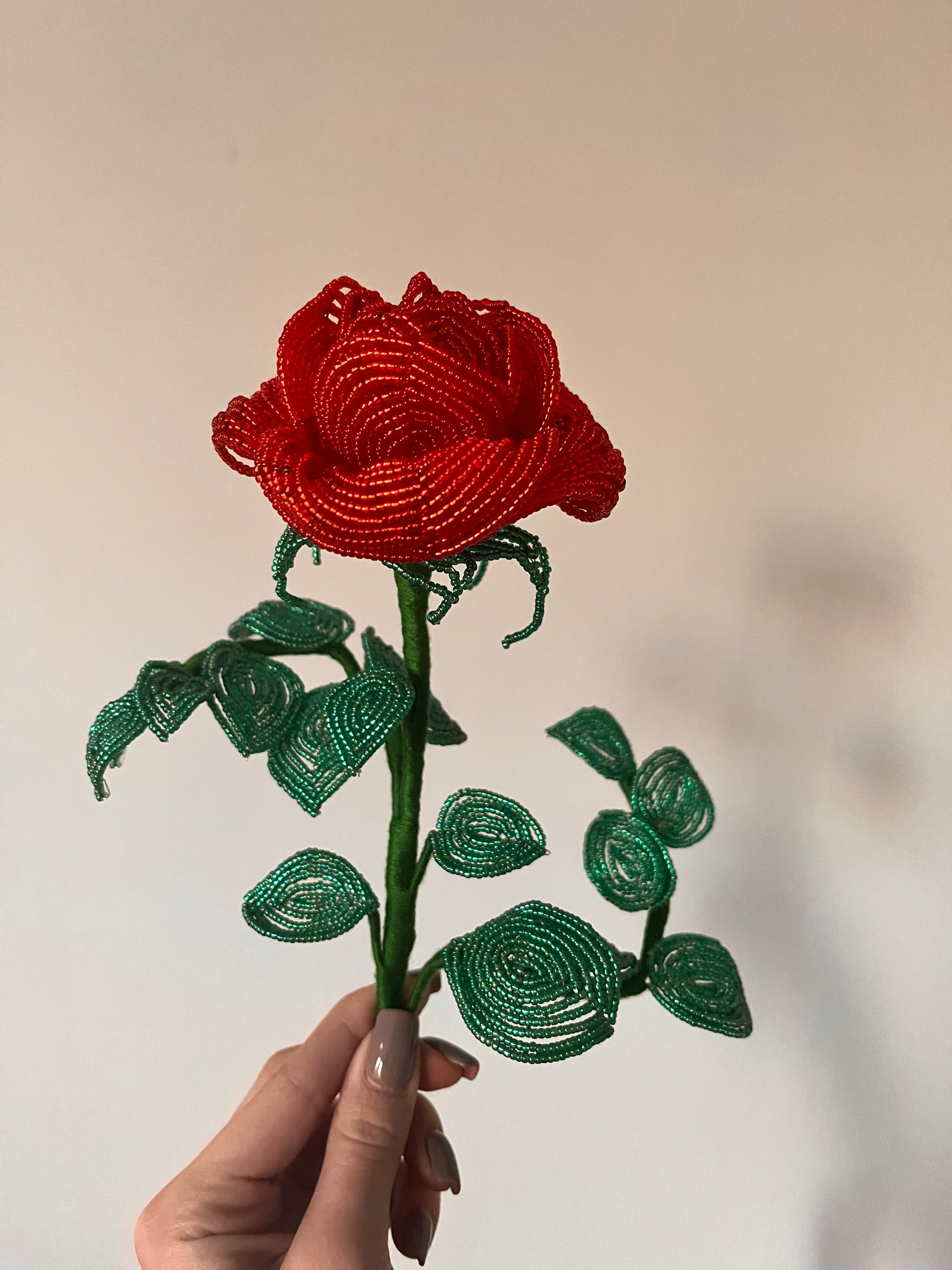 Minden darab kézzel készül, francia gyöngyfűzési technikával. Miyuki gyöngyökből és finom drótból formálva, aprólékos munkával. Egy-egy virág több órás, gondos kézimunka eredménye.
